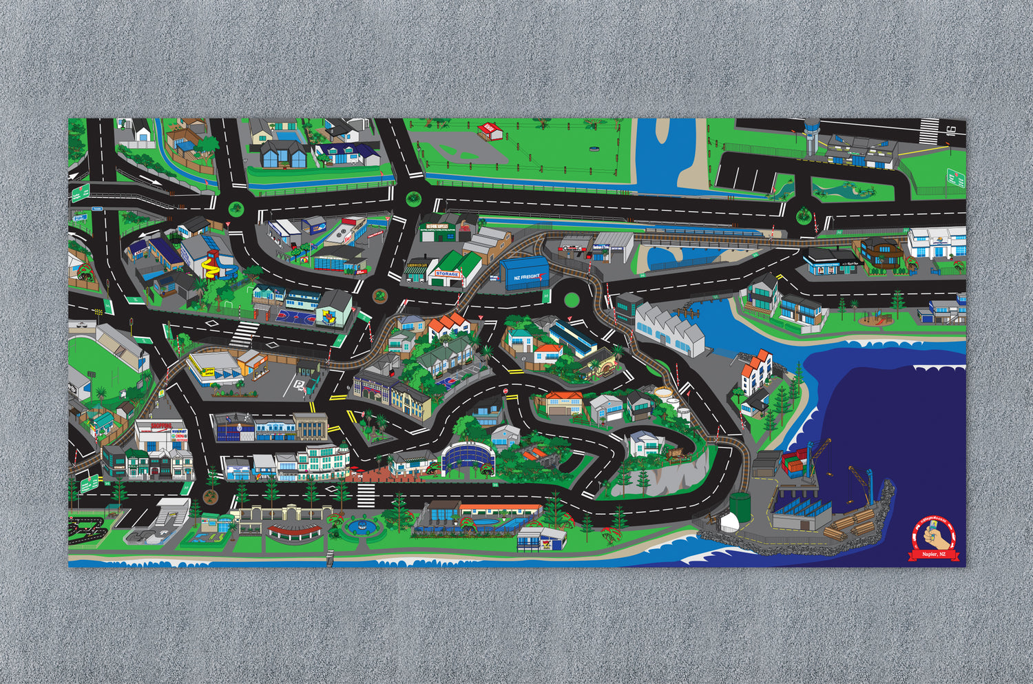 The Napier Play Mat features well known landmarks like Marine Parade Bike Park, Skate Park, Sound Shell and Ocean Spa, Napier Port, Hawkes Bay Airport, Aquatic Centre, Mclean Park, and many iconic Art Deco buildings. Let the kids explore familiar sights in a whole new way.